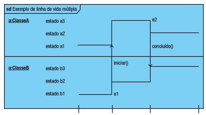 Por exemplo, na abaixo, o evento e1 causa uma mudança de estado em b:ClasseB. O objeto b:ClasseB responde enviando a mensagem de iniciar() para o objeto a:ClasseA. Posteriormente, o evento e2 causa uma mudança no estado do objeto a:ClasseA, na qual ele termina por enviar a mensagem concluido() para b:classeB, fazendo com que b mude de estado novamente.