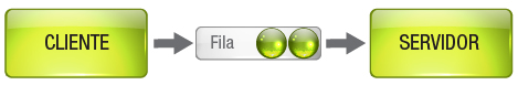 Clientes enviam as solicitações para uma fila, onde a mensagem é armazenada até que o aplicativo a remova. Após o cliente colocar a mensagem na fila, ele continua a sua execução sem esperar que esta mensagem seja retirada da fila. |