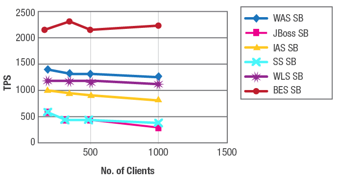 Apenas para ilustrar, a figura abaixo mostra como seis diferentes versões do mesmo aplicativo implementado usando diferentes servidores de aplicação JEE se comportam com um aumento de carga de 100 para 1.000 clientes.
