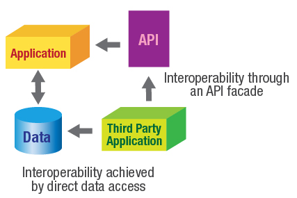 A alternativa é a interoperabilidade a ser alcançada através de uma API. Neste caso, os dados brutos que a aplicação possui estão escondidos atrás de um conjunto de funções que facilitam o acesso controlado aos dados. Desta forma, as regras de negócios podem ser garantidas através da implementação da API.