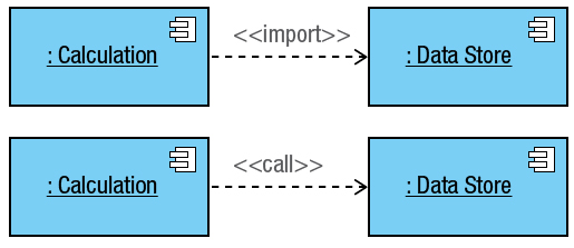 A figura a seguir mostra duas variantes do diagrama de componentes na figura anterior. Cada um deles usa um estereótipo para fornecer detalhes adicionais sobre o sentido da seta de dependência. Isso não torna a dependência completamente inequívoca, no entanto ainda depende de interpretação do leitor para os estereótipos de "importação" ou "chamada".