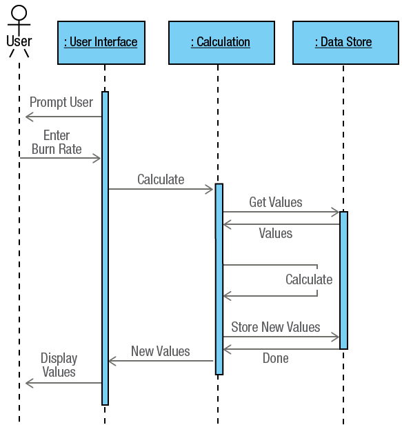 O diagrama de sequência exemplo mostra o cenário de usuário que obtém uma velocidade de combustão do usuário, Calcula, Recupera o estado do lander do armazenamento de dados e atualizações das informações e, em seguida, retorna o estado do lander para a Interface do Usuário.