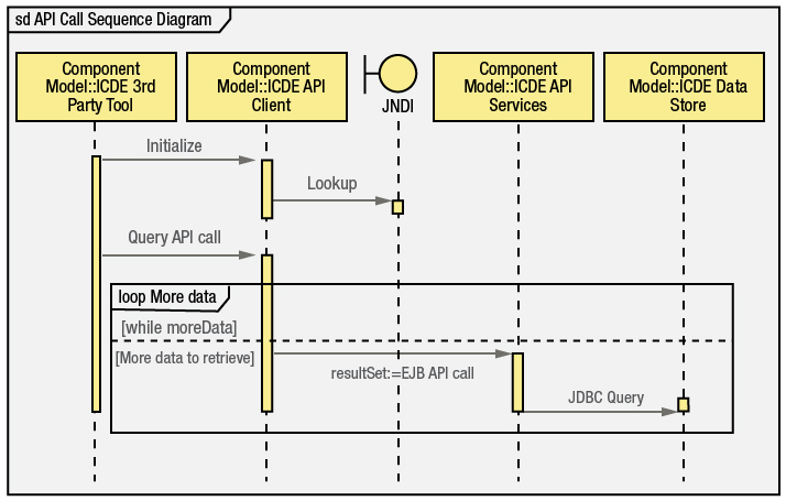 Um diagrama de sequência para uma chamada API é mostrado na figura a seguir. A API fornece uma chamada explícita "Inicializar", que deve invocar ferramentas. Este faz com que o cliente API ICDE estabeleça referências para os beans de sessão sem estado EJB usando o serviço de diretório JEE (JNDI).