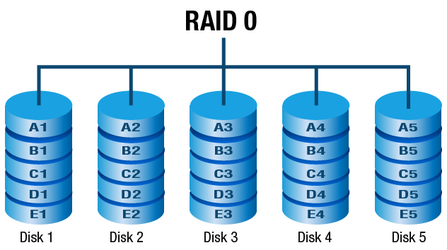 Observe na imagem acima como os arquivos A, B, C, D e E são fragmentados em cinco partes e cada parte é colocada em um disco. Para ler o arquivo, as cinco partes devem ser juntadas.