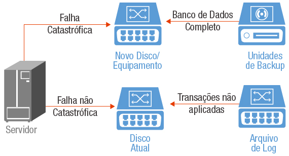 Se houver dano extensivo a uma grande parte do banco de dados devido à falha catastrófica, como uma falha de disco, o método de recuperação restaura uma cópia antiga do banco de dados que teve backup para o arquivamento (normalmente, fita ou outro meio de armazenamento off-line de grande capacidade) e reconstrói um estado mais recente, reaplicando ou refazendo as operações das transações confirmadas do log em backup, até o momento da falha.