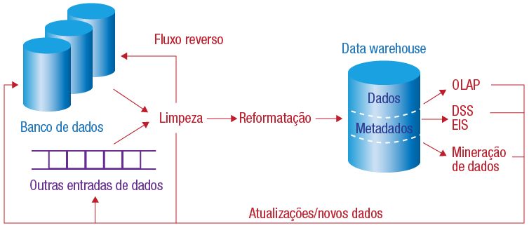 A figura a seguir oferece uma visão geral da estrutura conceitual de um data warehouse. Ela mostra o processo inteiro de data warehousing, que inclui a possível limpeza e reformatação dos dados antes que sejam carregados no armazém. Esse processo é tratado por ferramentas conhecidas como ferramentas de ETL (extração, transformação e carga). No final do processo, tecnologias de OLAP, mineração de dados e DSS podem gerar novas informações relevantes, como as regras; essas informações aparecem na figura a seguir, voltando ao armazém. A figura também mostra que as fontes de dados podem incluir arquivos.