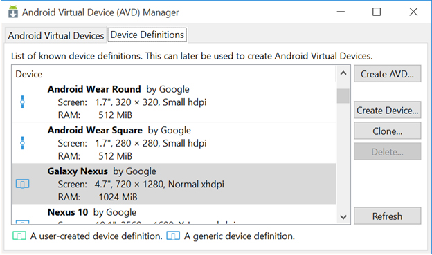 Como estamos procurando facilitar esse procedimento, iremos optar pela opção 2 (AVD já previamente configurado) clicando na aba “Device Definitions”, conforme a figura abaixo.