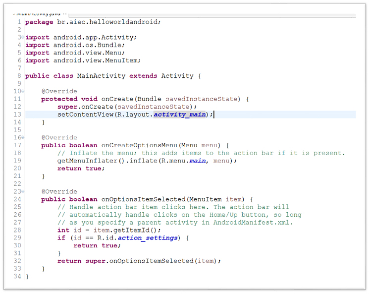 O código a seguir demonstra a activity principal (MainActivity.java) do nosso projeto HelloWorldAndroid que foi criada automaticamente pelo ADT plugin: