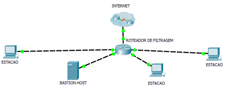 Essa é a topologia mais simples, que consiste em apenas uma máquina conectada tanto à rede pública quanto à rede protegida, porém com a função de roteamento desabilitada. Dessa forma, para a rede protegida acessar a rede pública, ela necessitará utilizar algum recurso presente na máquina em questão, como um Proxy ou NAT, tal como mostrada na figura.