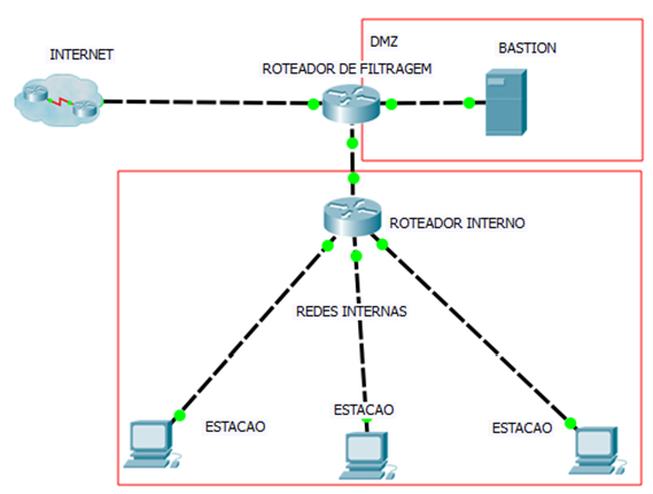 A rede DMZ fica protegida por dois roteadores, um externo ligado à internet e um interno ligado à rede interna. Esses roteadores devem ser configurados corretamente para permitir apenas as conexões estritamente necessárias. Os bastion hosts continuam a ser o contato com a rede pública e possuem serviços para a rede interna, como proxies e serviços públicos como correio eletrônico e páginas www públicas.