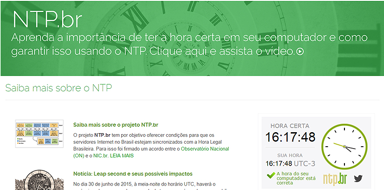 Veja na figura acima que ele verifica a hora de seu computador e diz se está certa ou errada. A hora da figura corresponde o momento em que a tela no ntp.br foi capturada (a máquina está com a configuração: time-b.nist.gov [clique no relógio abaixo à direita -> alterar configurações de data e hora... -> abra a aba “horário na Internet” -> alterar configurações -> selecionar “Sincronizar com um servidor de horário na Internet” -> escolher “time-b.nist.gov”]).