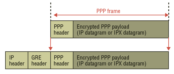 A Figura acima apresenta uma estrutura básica de um pacote PPTP, contido dentro de um pacote IP.