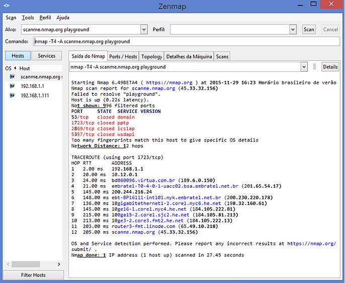 Os únicos argumentos que o Nmap utiliza nesse exemplo são -A, para habilitar a detecção de SO e a versão, -T4 para execução mais rápida, e os hostnames de dois alvos.