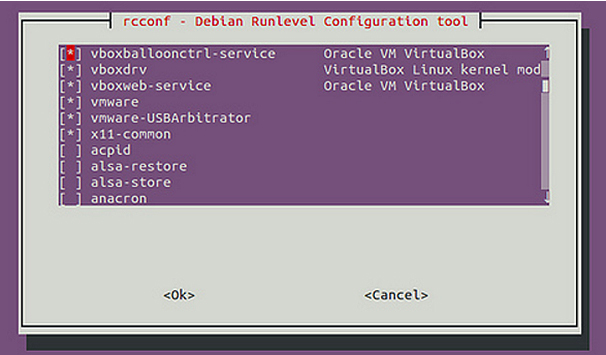Outra forma de gerenciar serviços é com o comando rcconf. Ele pode ser instalado através do comando apt-get install rcconf. Após instalado, basta executá-lo para ser apresentado a um menu bastante prático, onde se pode habilitar e desabilitar os serviços desejados.