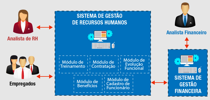 O Sistema de Gestão de Recursos Humanos possui uma importante integração com o Sistema de Gestão Financeira. Ambos os sistemas possuem um conjunto de funcionalidades disponíveis para os usuários. Cada um dos sistemas em questão possui suas fronteiras específicas. Por sua vez, o Sistema de Gestão de Recursos Humanos possui diversos módulos e ambos também possuem fronteiras específicas.