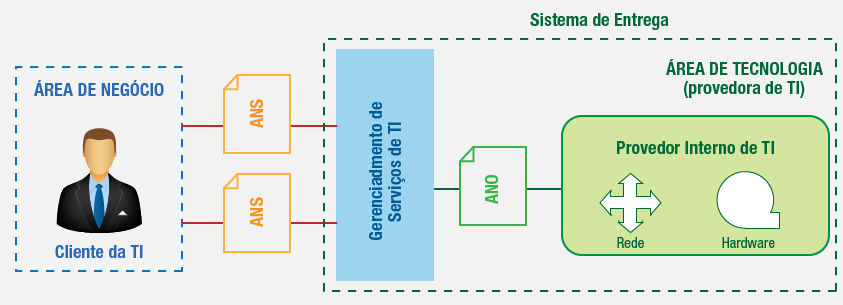 O cliente da área de TI consome os serviços disponíveis. Um serviço disponibilizado por um sistema de informação que, para que esteja disponível e opere conforme os ANS estabelecidos, dependente de um serviço interno de rede – sem a disponibilidade da rede, haverá comprometimento no fornecimento do primeiro serviço. A estes serviços internos serão atribuídos os Acordos de Níveis Operacionais.