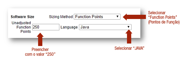 Para fins de exemplo, considerar o tamanho de 250 Pontos de Função e linguagem de programação JAVA, conforme ilustra a figura abaixo: