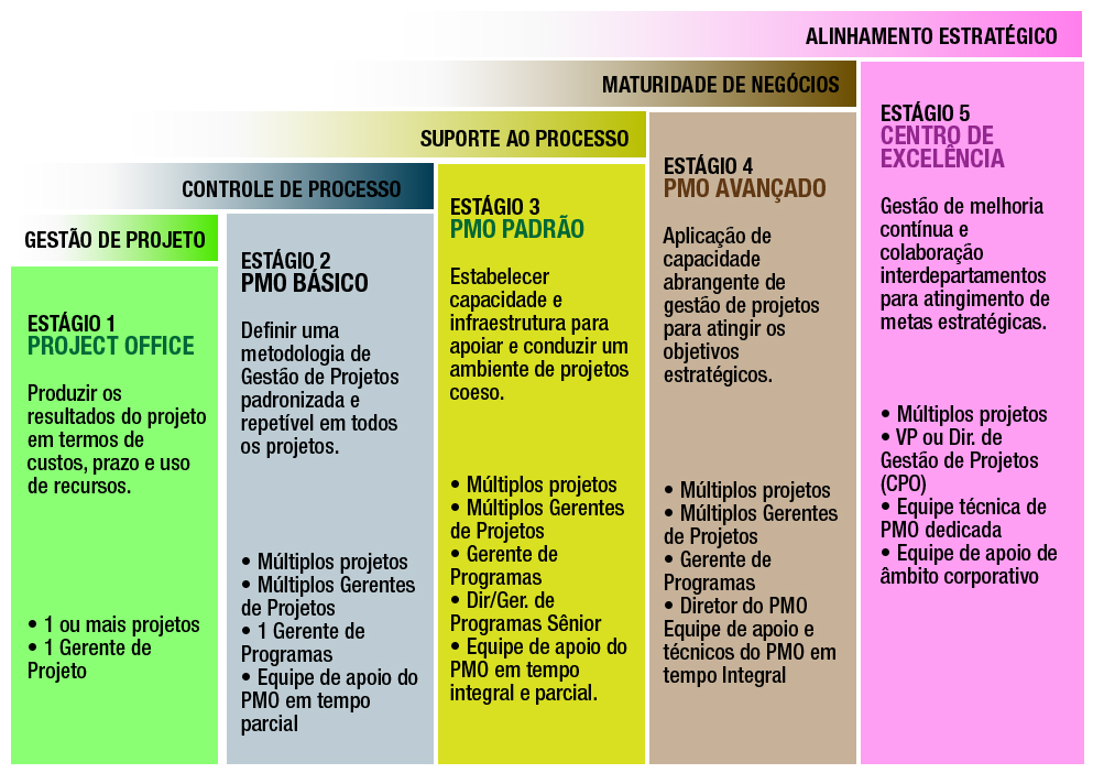 Nesse modelo, cada nível subentende um escopo particular de capacidade funcional; os estágios superiores são pré-requisitos para as competências dos estágios anteriores; porém, mesmo devendo esses estágios ser obrigatoriamente cumpridos, a organização pode executar atividades em mais de um nível, num dado instante. Assim, podemos ter vários Escritórios de Gerenciamento de Projetos e um Centro de Excelência corporativo simultaneamente.
