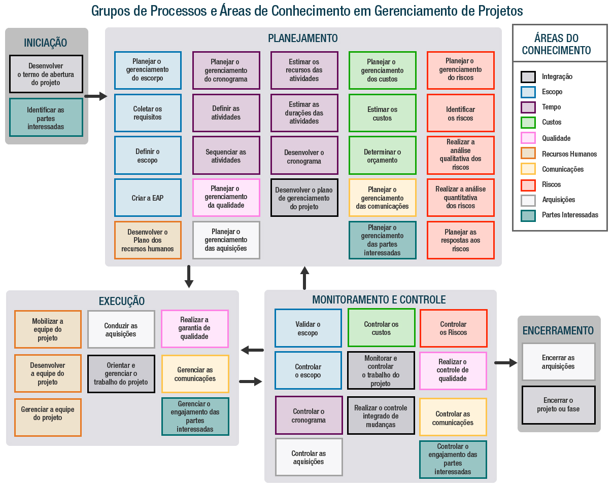 De acordo com o que estudamos anteriormente, podemos perceber que gerenciar projetos é, sem dúvida, uma arte, e como toda arte precisa ser bem arquitetada, devidamente desenvolvida para que tudo ocorra conforme planejado. O Guia de Boas Práticas do Gerenciamento de Projetos, o PMBOK®, em sua 5ª edição, elenca 10 áreas de conhecimento compostas por processos de gerenciamento, com o intuito de facilitar a prática em si. São elas: