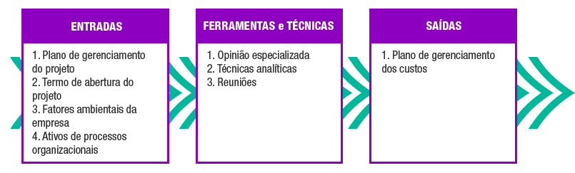 Abaixo estão listadas as entradas, as ferramentas e técnicas e as saídas do processo Planejar o Gerenciamento dos Custos.