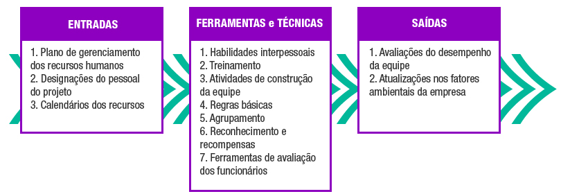 Na imagem estão representadas as entradas, as ferramentas e técnicas, bem como as saídas do processo Desenvolver a Equipe do Projeto.