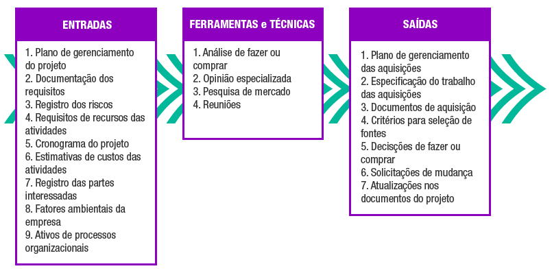 Abaixo estão listadas as entradas, ferramentas e técnicas e saídas do processo Planejar o Gerenciamento das Aquisições.