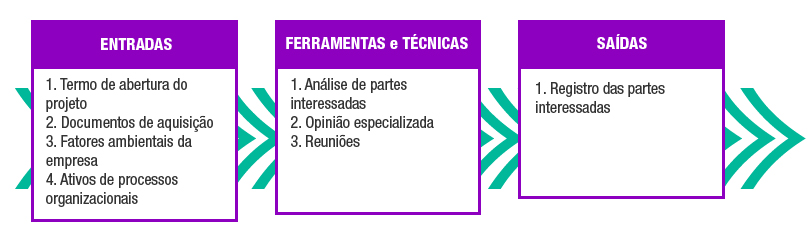 Abaixo estão listadas as entradas, ferramentas e técnicas e saídas do processo Identificar as Partes Interessadas.