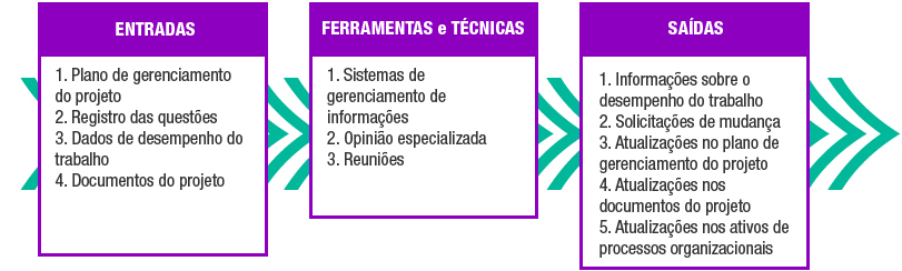 Na imagem a seguir estão listadas as entradas, as ferramentas e técnicas e as saídas desse processo.