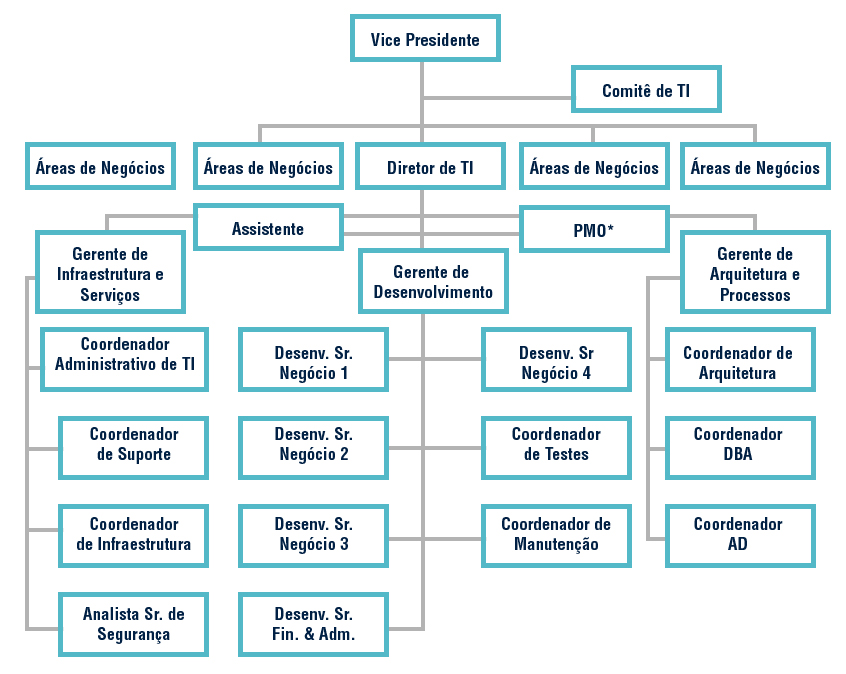 Percebemos então que a palavra estrutura pode ser usada para diversos aspectos, tudo depende da visão e da necessidade. Necessidade essa de demonstrar as partes de um todo, que juntos formam uma estrutura única. No exemplo abaixo é apresentada a estrutura de uma empresa, percebe-se que há uma hierarquia funcional entre os cargos, que são representados por caixas. Essa hierarquia demonstra uma precedência de regras e atividade do dia a dia. Na altura superior da estrutura está o Vice Presidente e então vai descendo, explorando a área da Direção da TI, que possui três gerências no mesmo nível hierárquico (Gerência de Infraestrutura e serviços, Gerência de Desenvolvimento e Gerência de Arquitetura e Processos). Essas gerências estão subdivididas internamente, conforme características de cada área.