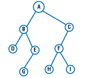 Sendo assim temos outras relações de parentesco conforme figura acima, onde B e C são filhos de A, B e C são irmãos, D e E são irmãos e H e I são irmãos. Outra forma visualizada na figura é que C é pai de F, que é pai de H e I. As letras B, C, E, F são chamados de nós, e as letras D, G, H, I são nós sem filhos, que são chamados de folhas. |
