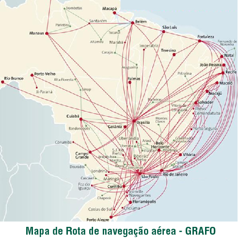 Estritamente, em matemática, a teoria dos grafos é utilizada para representar o relacionamento entre dois ou mais conjuntos, grandezas ou valores. A representação de um mapa de rotas, redes e outros modelos semelhantes podem ser feita por meio do que se denominam grafos. Vamos tomar, por exemplo, um mapa de rotas aéreas. Na figura abaixo, nota-se que existem várias rotas de um ponto a outro, por exemplo, de Florianópolis a Brasília existem as possibilidades via Curitiba, via São Paulo ou via Rio de Janeiro. Algumas rotas podem ter mais escalas, por exemplo, pode-se ir a Brasília por São Paulo, passando por Curitiba, Rio e Belo Horizonte. Podemos ter também um voo panorâmico, onde o avião sai de um lugar e volta para o mesmo lugar. Por exemplo, voo de São Paulo para São Paulo, onde o avião sai do aeroporto de Congonhas sobrevoa a cidade e volta para Congonhas.