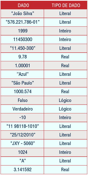 na tabela abaixo, alguns exemplos de tipos de dados, incluindo o dado