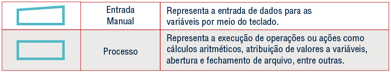 | Em um fluxograma, as variáveis identificadas no símbolo de entrada manual recebem as informações digitadas pelo usuário. No símbolo de processo a operação indica qual variável recebe o resultado do cálculo, conforme o exemplo a seguir.