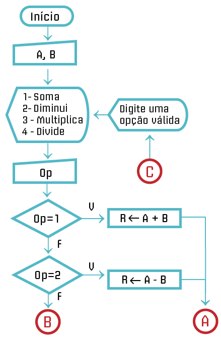 No trecho do fluxograma anterior podemos identificar as variáveis: A, B, Op e R. |