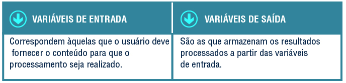 | 3- Variáveis de Entrada e de Saída É possível imaginar uma variável como sendo um local onde se pode colocar qualquer valor do conjunto de valores possíveis para o tipo definido para a variável. As variáveis podem ser denominadas de entrada ou de saída.