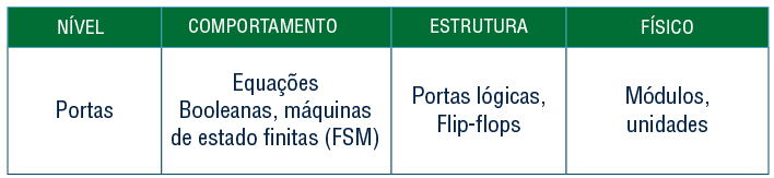 As portas e flip-flops são células digitais que, ao serem grupadas, formam módulos ou unidades aritméticas e de memória. Os módulos são utilizados na composição básica ao nível de registradores. Utilizando-se de equações booleanas e Finite State Machines - FSMs (diagramas de máquinas de estados finitas) é possível descrever o comportamento de cada módulo. |