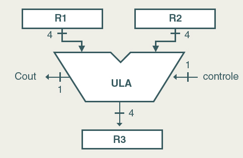 A figura 04 é um exemplo de um diagrama de blocos, que representa uma ULA (Unidade Lógica e Aritmética) e também os registradores para a entrada e saída. Eles são componentes que constituem partes essenciais de qualquer tipo de sistema computacional. |