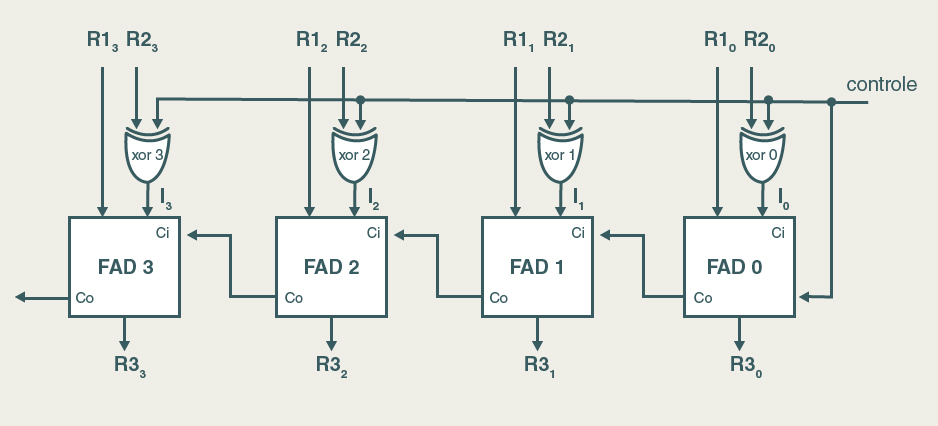 Para exemplificar o que falamos no parágrafo acima, podemos observar na figura 05, uma representação de um diagrama de blocos com um nível de detalhamento maior da ULA (Unidade Lógica e Aritmética). Você já havia observado na Figura 04 um diagrama de blocos que representa a ULA de uma maneira menos detalhada. |