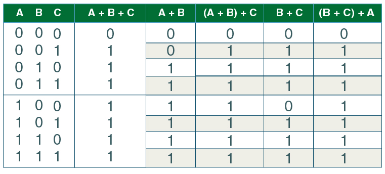 | Torna-se importante frisar que, em virtude do fato de haver somente um operador na equação, pode-se fazer também uma avaliação da equação dividindo-a em pares. Para melhorar o entendimento vamos supor que primeiramente vamos achar o resultado de A+B, para então operar os valores resultantes com os respectivos valores de C. Esta propriedade é conhecida como associativa. A ordem das variáveis não é importante em virtude da propriedade comutativa, sendo assim a ordem em que são avaliadas as variáveis A, B e C é irrelevante. Estas propriedades são visualizadas pela tabela verdade abaixo. Nesta tabela, os parêntesis servem para indicar as subexpressões que já foram avaliadas na coluna imediatamente à esquerda. Você deve ter observado que os valores das colunas referentes às expressões A+B+C, (A+B)+C e (B+C)+A são os mesmos (na mesma ordem).
