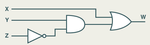 | 2 - Exemplo de Circuito Lógico Nosso objetivo até o momento é obtermos conhecimento suficiente para que, ao observar uma equação booleana qualquer, tenhamos capacidade de desenhar a implementação do circuito lógico. Vamos lá? Um circuito lógico tem por característica ser composto pelas portas lógicas relacionadas às operações realizadas sobre as variáveis de entrada. Então, os resultados das operações são conduzidos por meio de fios que representamos com a utilização de linhas simples. Os passos que devemos seguir para fazermos um desenho do circuito lógico tendo por base uma equação são similares aos usados na avaliação da expressão. Vamos usar como exemplo a equação (W= X + Y . ). O primeiro passo é identificar quais são as variáveis independentes, que neste exemplo são X, Y e Z. Para cada variável iremos traçar uma linha (observando que será da esquerda para a direita), estas linhas irão representar os fios que conduzem os sinais elétricos (valores). Logo depois vamos desenhar as portas necessárias para representar cada uma das subexpressões. Observe que há regras para a ordem tomada para a avaliação, que é: