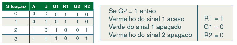 Antes de iniciarmos, é importante consultar a tabela verdade. Iniciando pela escrita da expressão de G1, em quais situações G1 acende? Resposta: nas situações 2 OU 3 Como se tem G1=1 na Situação 2 OU (OR) Situação 3, uma porta OU contendo as expressões tanto da situação 2 quanto da situação 3 resultará no valor 1 nesses casos, que representa a situação referente ao verde aceso do semáforo 1, consequentemente a expressão seria a seguinte: