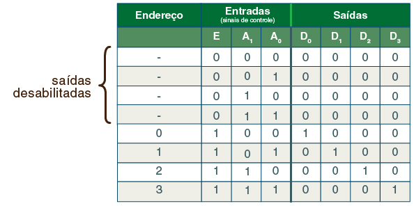 Como pode ser visto nas primeiras 4 linhas, o sinal de habilitação (E) vale zero, o que desativa as saídas, independentemente dos valores das demais entradas (A1e A0). |