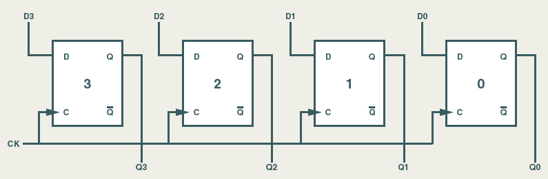 | A figura abaixo mostra um registrador de quatro bits, com carga paralela, utilizando flip-flops. A letra D representa os flip-flops. Observe a imagem acima e veja que cada flip-flop é o responsável por armazenar um bit, observando a notação posicional, e cada bit possui um caminho independente do restante, tanto na entrada como na saída. É por este motivo que o registrador é chamado de carga paralela. Continuando a observação da figura, vemos que o flip-flop, que tem por índice 3, armazena o bit mais significativo de uma palavra de quatro bits. O índice 0 (zero) armazena o bit menos significativo. Podemos dizer que um registrador tem um funcionamento