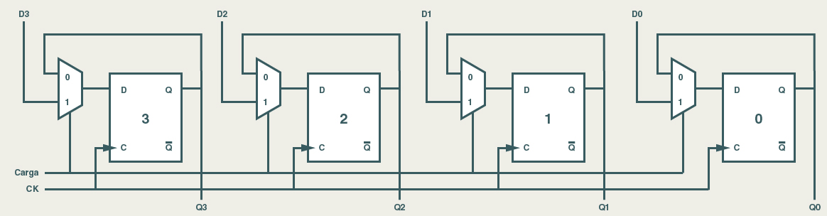 No registrador exemplificado na Figura 01 há uma deficiência importante: toda vez que o sinal de relógio CK passar por uma borda ascendente, os valores das entradas D0, D1, D2 e D3 serão copiados, mesmo não sendo o objetivo desejado. Contudo, cabe à Unidade de Controle coordenar e ordenar os sinais dos circuitos de um computador. Na verdade, o sinal de CK (relógio) tem por função determinar o momento no qual uma ordem deverá ser obedecida. Sendo assim, um registrador de uma máquina (computador) deve possuir os recursos necessários para a realização da carga do dado quando o relógio passar pela borda ativa apenas se o sinal de “load” (carga) estiver ligado. Na figura abaixo é possível observar um registrador de quatro bits com sinal de carga e carga paralela.