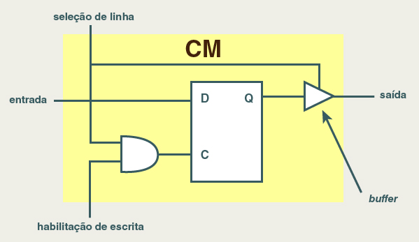 | Olhando pelo lado estrutural, uma memória RAM tem sua organização feita semelhante a uma matriz de elementos básicos de memória, buffers de entrada/saída e decodificador de endereços. Conforme é possível observar na figura 11, uma CM (célula de memória) pode ser representada por meio de símbolo, sendo constituída por um latch D controlado cuja entrada está ligada à saída e a saída ligada à entrada de um buffer.