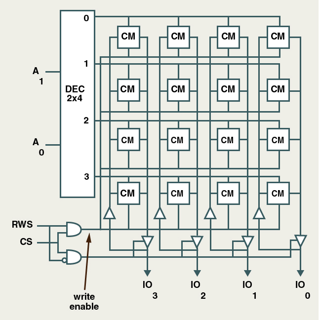 | A Figura 12 é uma representação da memória RAM por meio de um diagrama de blocos. Trata-se de um exemplo de memória RAM (4X4), formada por dezesseis CMs. Para cada acesso à memória, o decodificador de endereços ativa o sinal de seleção de linha associado ao endereço aplicado às suas entradas, o que ativa todos os CMs da linha escolhida. Assim, caso RWS seja igual a zero (0) e CS igual a um (1), os bits que estão armazenados na linha escolhida passarão pelos buffers de saída das respectivas CMs e também pelos buffers de entrada e saída do chip.