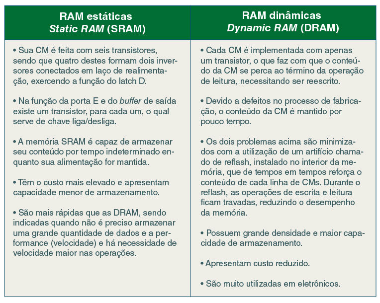 Nós vimos aqui a CM representada pela composição de um latch D e duas portas, entretanto, muitos fabricantes utilizam estruturas menos complexas e também com poucos transistores. A maneira como é feita a implementação de CMs é que determina a classificação da memória RAM em estática e dinâmica. |