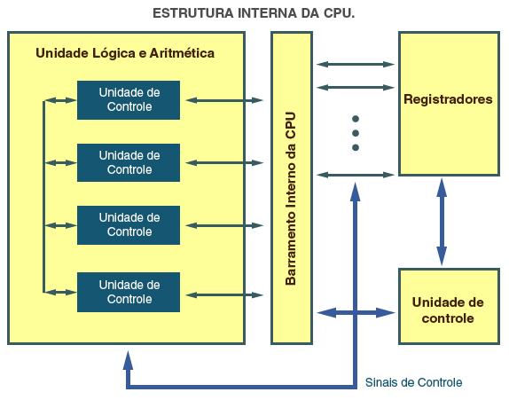 Para a execução dessas ações, a UCP necessita guardar temporariamente alguns dados. Ela manterá a posição de memória da última instrução, para ter ciência da próxima instrução, e necessita também de armazenar temporariamente dados e instruções, enquanto determinada instrução é executada. Em suma, a UCP precisa de uma pequena memória interna. Você deve estar lembrado que os componentes mais importantes da UCP (CPU) são a ULA (unidade lógica e aritmética) e a UC (unidade de controle). Cabe à ULA efetuar o processamento de dados e a UC o controle da operação da ULA como também pela transferência de dados e instruções para fora e para dentro da UCP. A figura abaixo mostra o barramento interno da UCP, que nada mais é do que os caminhos de transferência de dados e de sinais de controle. Cabe a ele ser o responsável pela transferência dos dados entre os vários registradores e a ULA, uma vez que a ULA opera apenas com dados localizados na memória interna da UCP. A figura também mostra os elementos básicos de uma ULA.