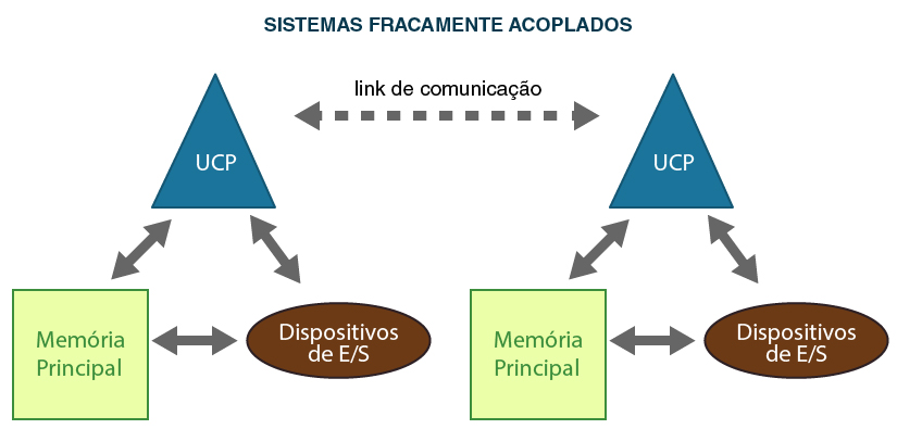 | 2) Multicomputadores: este tipo de arquitetura é composta por ambientes fracamente acoplados, onde os processadores têm suas próprias memórias locais e a comunicação entre processos é caracterizada por “troca de mensagens entre os processos que estão executando nos processadores” (DANTAS, 2005). Há uma boa escalabilidade da estrutura da máquina.