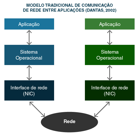 Durante o estudo deste módulo teremos a oportunidade de entender por que os sistemas computacionais necessitam de redes de comunicação cada vez mais eficazes, mas que, apesar do aumento da disponibilidade destas redes, o desempenho das aplicações não tem evoluído na mesma proporção, visto que são utilizados dispositivos de redes inadequados nos novos projetos de distribuição de recursos e também de pacotes de softwares. O incremento na oferta de largura da banda nos meios físicos de transmissão de concessionárias de telecomunicações e energia elétrica, assim como TV a cabo, tem permitido o desenvolvimento de novas tecnologias para aumentar a eficiência dos recursos disponibilizados. Urge fazer com que as aplicações sejam executadas com melhor desempenho, utilizando um maior volume de dados e fazendo uso de interfaces de rede, sistemas de interconexões de alta velocidade e protocolos mais leves para que a taxa efetiva de transmissão seja maximizada. No modelo tradicional, o sistema operacional acessa uma interface de rede (network interface card - NIC), podendo ser uma rede local (LAN) ou geograficamente distribuída (WAN), para a realização de uma aplicação, sendo que a rede é a responsável pelo envio das mensagens para a NIC do computador onde está a aplicação destinatária, fazendo o caminho inverso. |